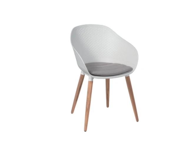 Deze witte designstoel Koperus is voor de meerwaardezoeker. De combinatie van witte kunststof, een frappuccino-kleurig zitkussen in olefin waterafstotend materiaal en massief houten poten in teak zorgen voor dit prachtige tuimeubel. Ontdek ook de rest van het Gescova-aanbod in onze webshop.Â