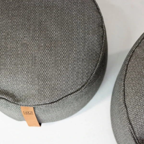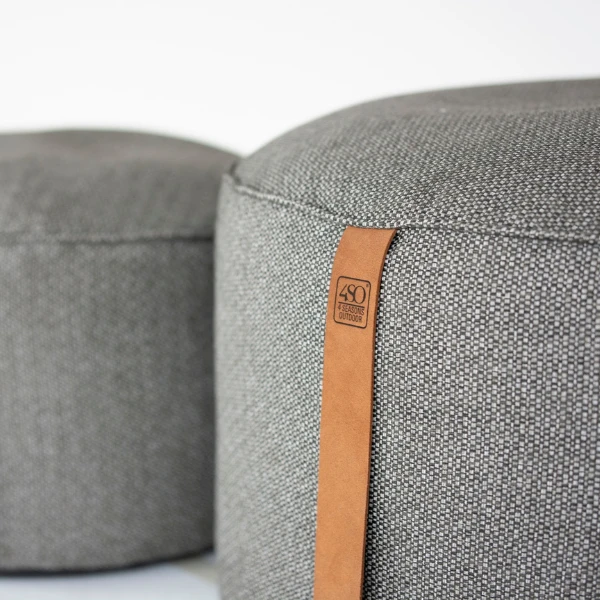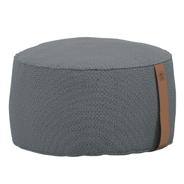 Poef voor buiten Fontaine met een diameter van 72cm. Bestaat uit antracietkleurig olefin en afgewerkt met lederen handvat.Â