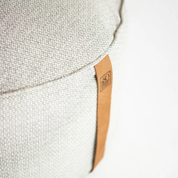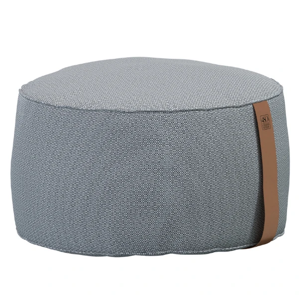 Poef voor buiten Fontaine met een diameter van 72cm. Bestaat uit grijs olefin en afgewerkt met lederen handvat.Â