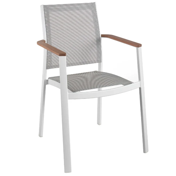 De Billie tuinstoel heeft een rugleuning en zitting in grijs textileen en witte poten in mat aluminium. De armleuningen van de stoel zijn vervaardigd uit massief teak. Deze Billie stoel is bovendien stapelbaar en zal perfect passen op jouw balkon of terras!