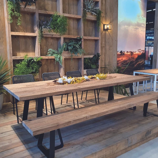 De tuinbank Margarite heeft een opvallend design dat jouw terras meteen een stijlvolle look zal geven. De bank heeft een zwart ijzeren frame en een zitting uit massief teakhout. Teakhout is een duurzame hardhoutsoort die uiterst geschikt is voor tuinmeubelen. Met een lengte van 300cm biedt deze tuinbank plaats aan heel wat personen, ideaal voor een gezellige barbecue in de zomer! Combineer de bank met de bijhorende tafel voor een mooi geheel.Â