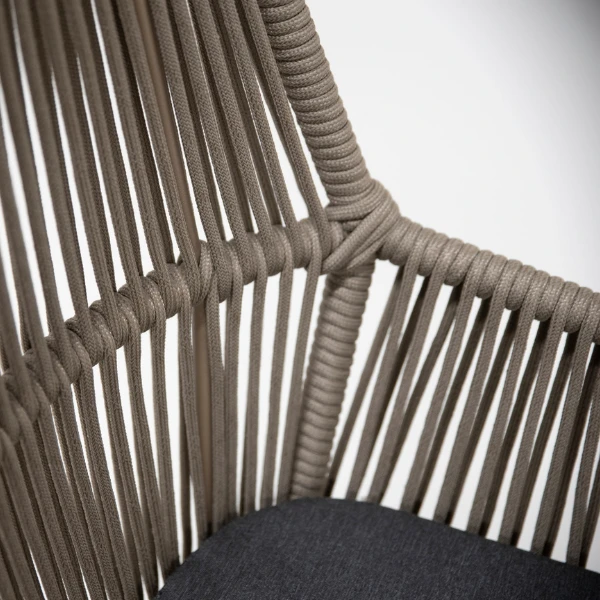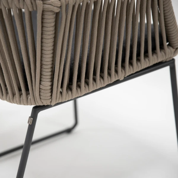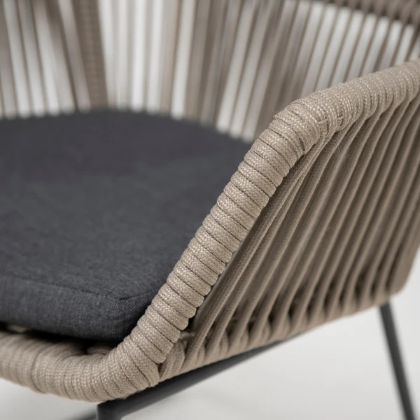 Geniet van het buitenleven met deze tuinstoel Mambo. De stoel bestaat uit een frame uit weerbestendig roestvrij staal, dat overtrokken is met een polypropyleentouw in taupe. Het antracietkleurig kussen is gemaakt uit olefin, een sneldrogend en duurzaam materiaal. De neutrale kleuren en het hip ontwerp geven deze set een uitnodigend karakter. Bekijk zeker ook de loungeset Mambo om de inrichting van je terras compleet te maken.Â