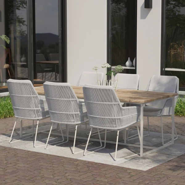 Deze strakke tuinstoel Valley blinkt uit door eenvoud. Het trendy minimalistische ontwerp van de stoel wordt extra in de verf gezet door de opvallende witte kleur. De stoel bestaat uit een stevig maar licht frame uit aluminium, dat afgewerkt is met polypropyleentouw. De kussens en de hoge rugleuning zorgen ervoor dat je comfortabel kunt tafelen tot in de vroege uurtjes. De kussens zijn gemaakt uit olefin, een sterk en weerbestendig materiaal. Bekijk zeker ook ons assortiment tuintafels voor de perfecte match.Â