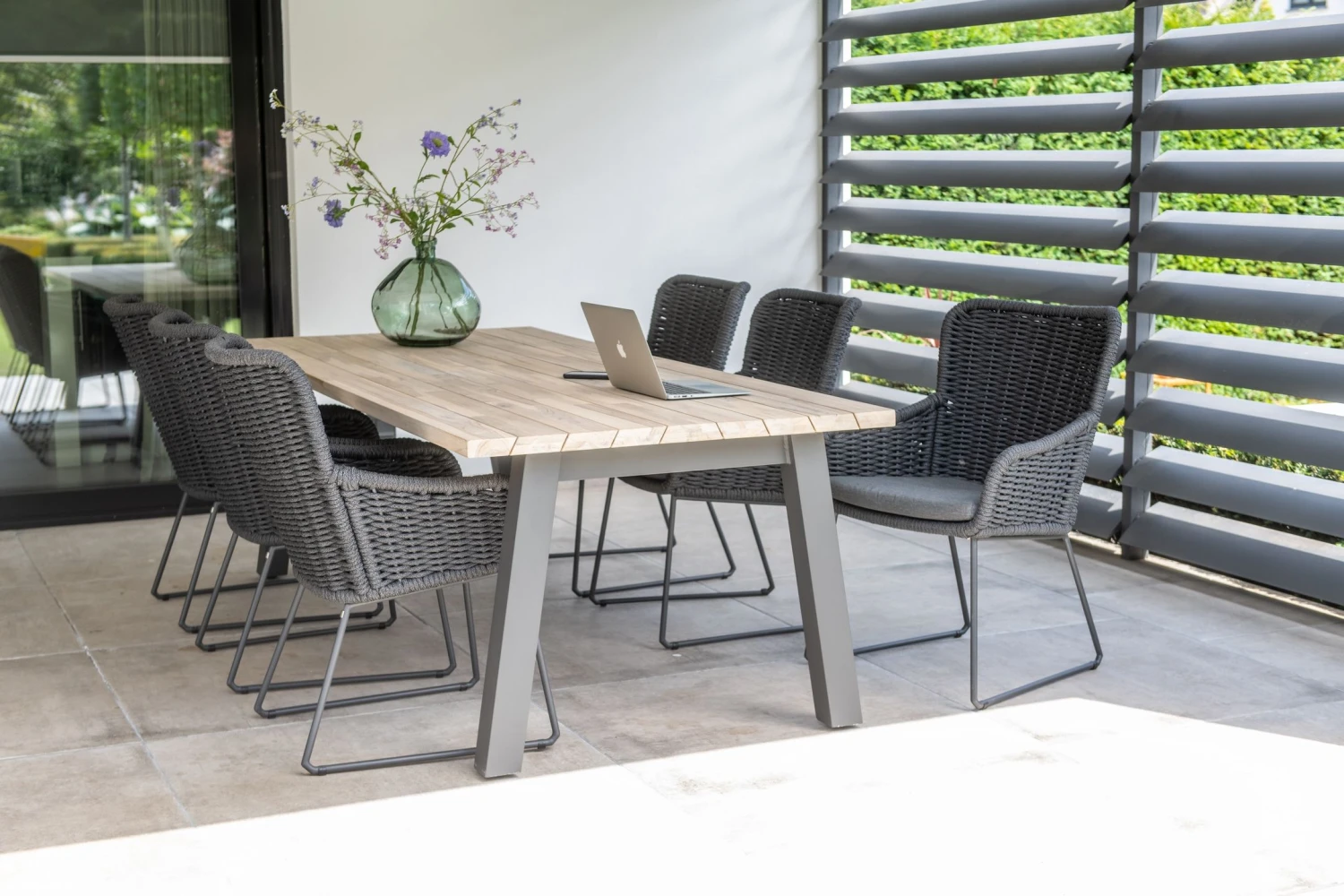 Deze Winno-tuinstoel is gemaakt uit aluminium en touw. De stoelen beschikken elk over een zitkussen uit Olefin, waardoor je in volle comfort kan genieten van een barbecue in de tuin. De stoelen meten 64 cm lang, 64 cm breed en 94 cm hoog. Â