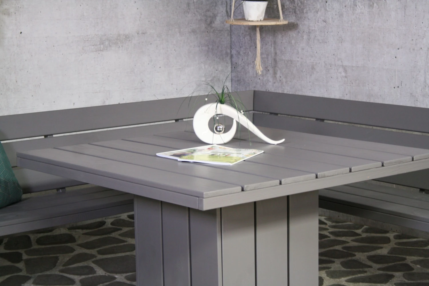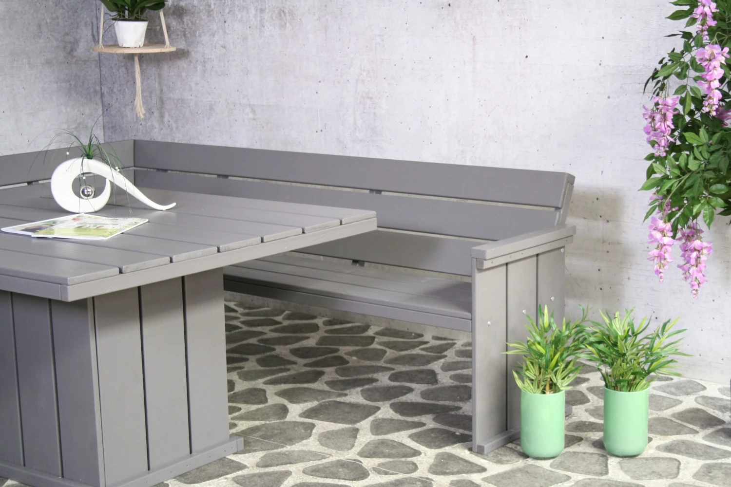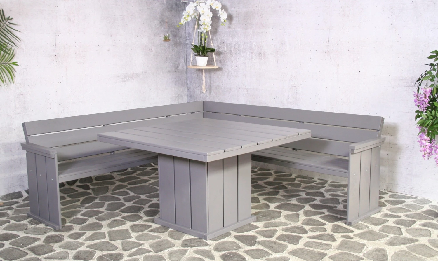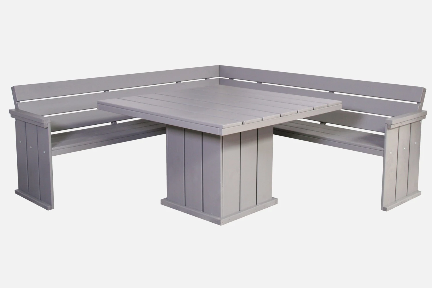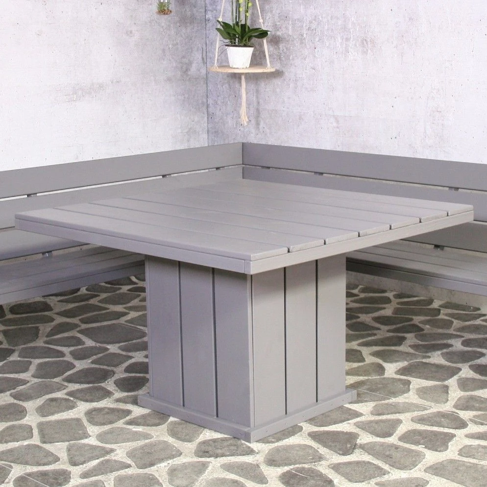 De grijze tuinmeubelen van de Brest collectie zijn gemaakt van duurzaam, Noord-Europees dennenhout. Met deze meubelen krijg je het gevoel in een hippe strandbar te vertoeven in je eigen tuin.