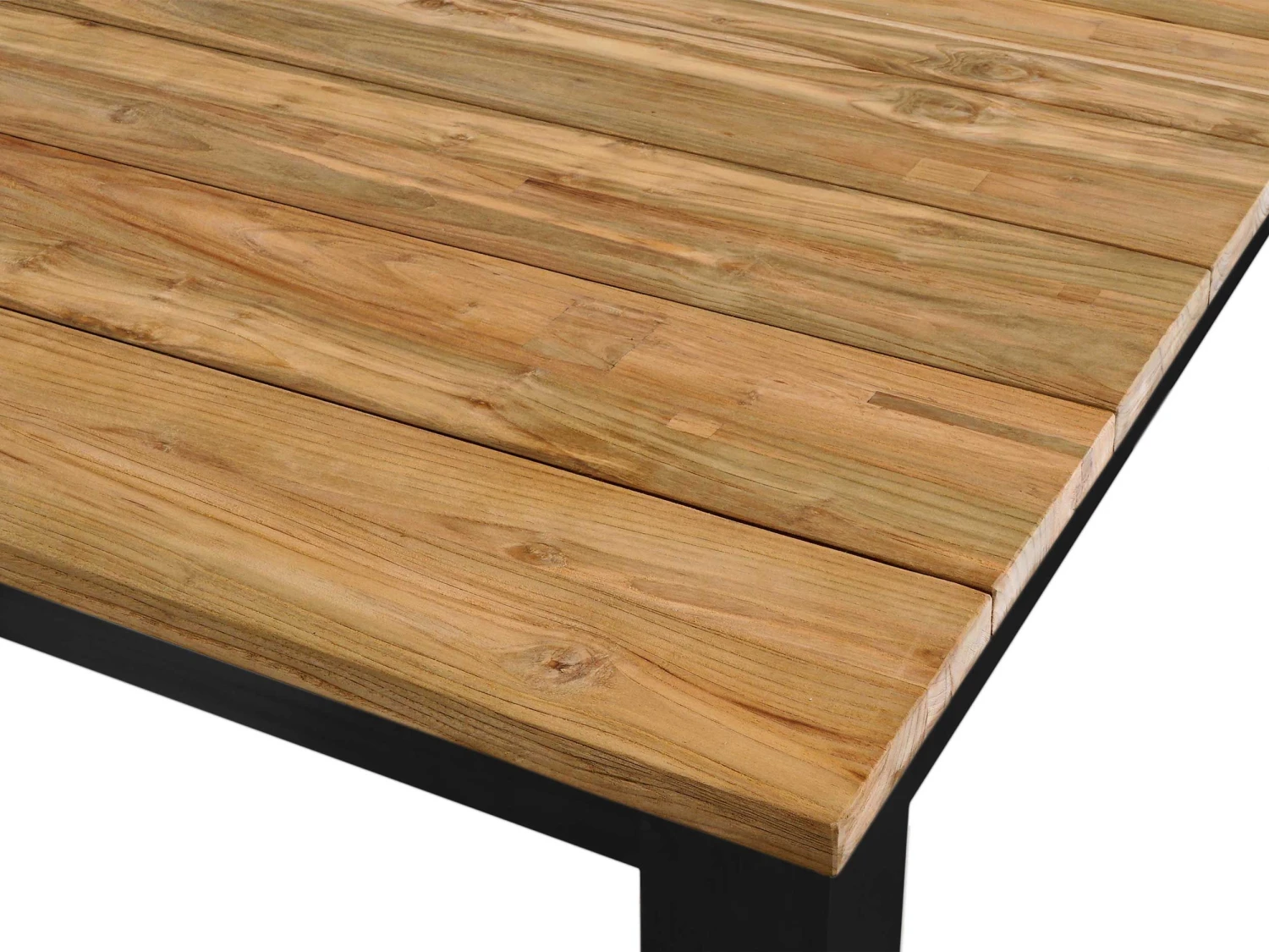 Tuintafel Floriaan, 160×160 cm, met aluminium poten en tafelblad uit teak. Geschikt voor 4 tot 6 personen.