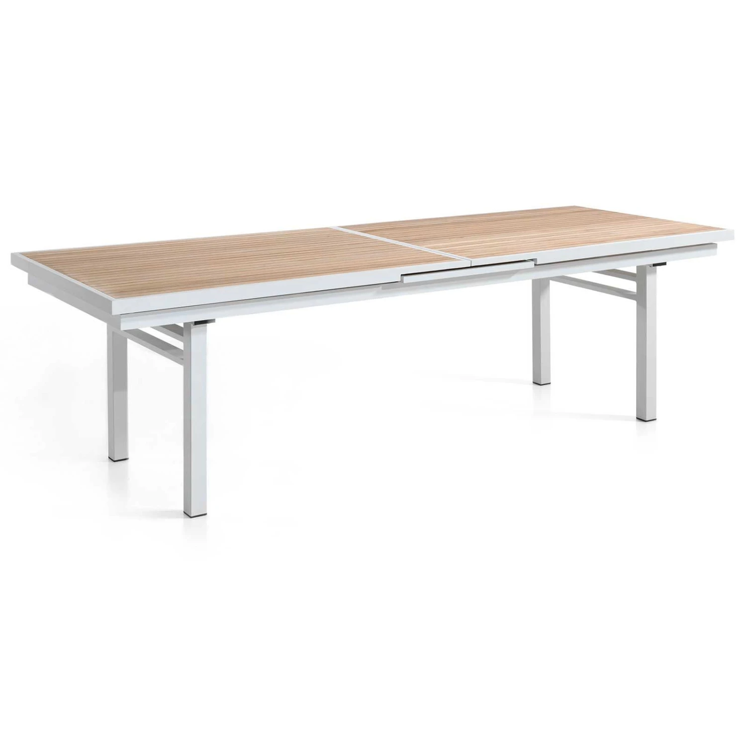 Verlengbare tuintafel Lucia met wit frame uit aluminium en blad uit massief teakhout. Lengte: 280 tot 340 cm.