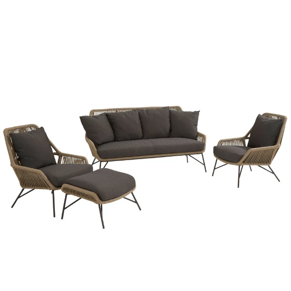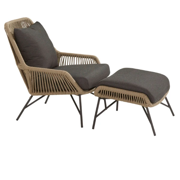 Dit voetbankje is de perfecte aanvulling voor de loungeset Mambo. Het krukje bestaat uit een stevig frame in roestvrij staal met een kussen in olefin. Olefin is een duurzaam materiaal dat snel droogt. Het frame is overtrokken met een polypropyleentouw in taupe. Je kan het voetbankje ook gebruiken als extra zitplaats of als bijzettafeltje.Â